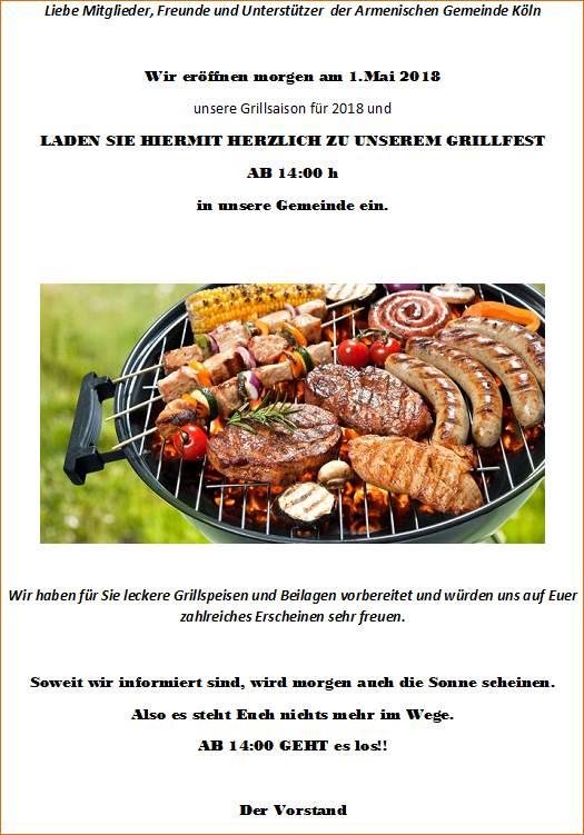 im Namen des ASC Akhtamar laden wir Euch herzlichst zu einem gemeinsamen Grillfest am 01.05.2019 (Maifeiertag) um 14:00 Uhr in unserer armenischen Gemeinde Köln Niehl ein. Wir freuen uns bei hoffentlich tollem Wetter auf einen schönen Nachmittag mit Euch und auf interessante Gespräche.