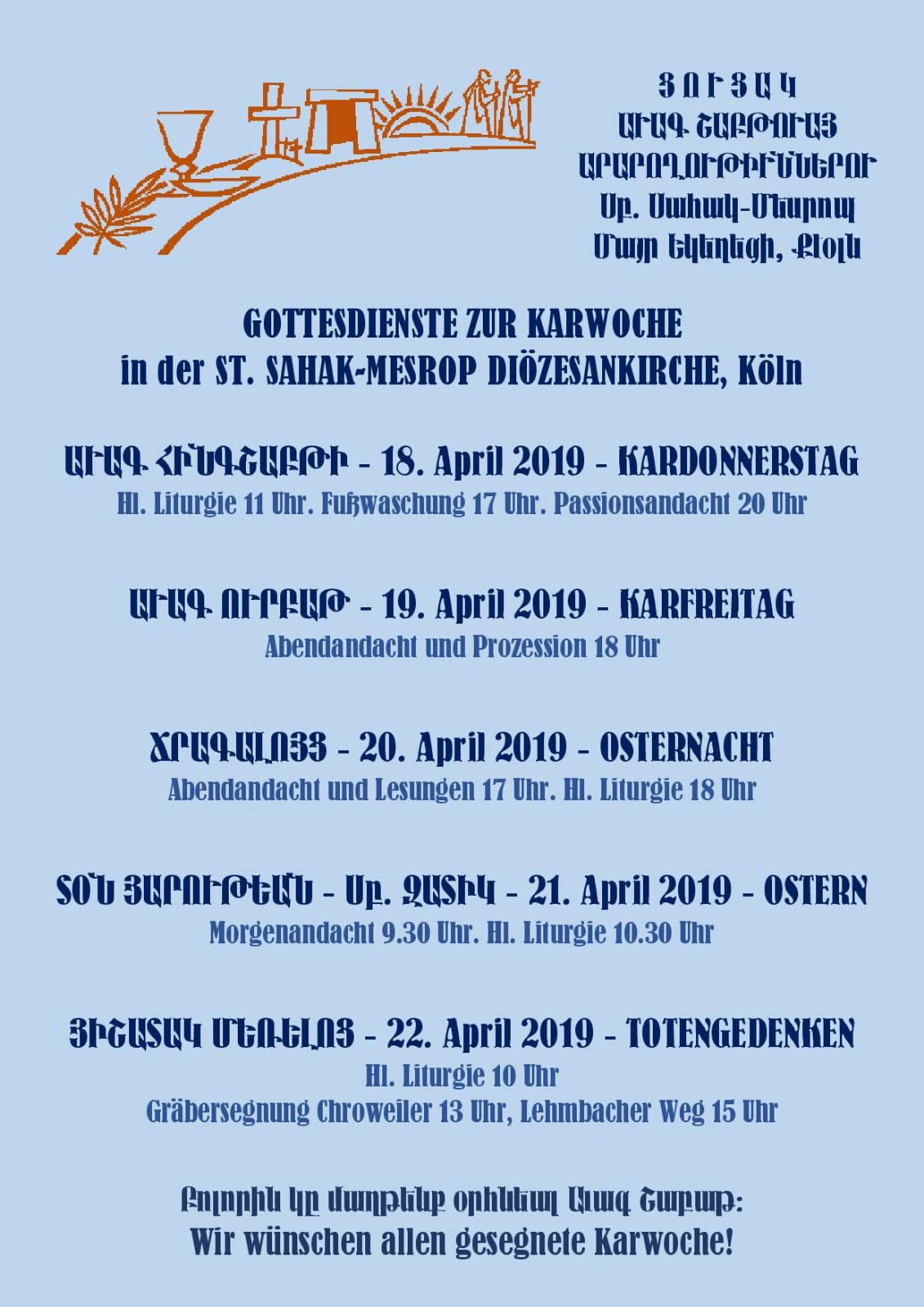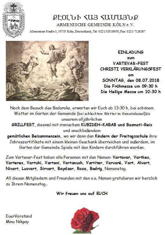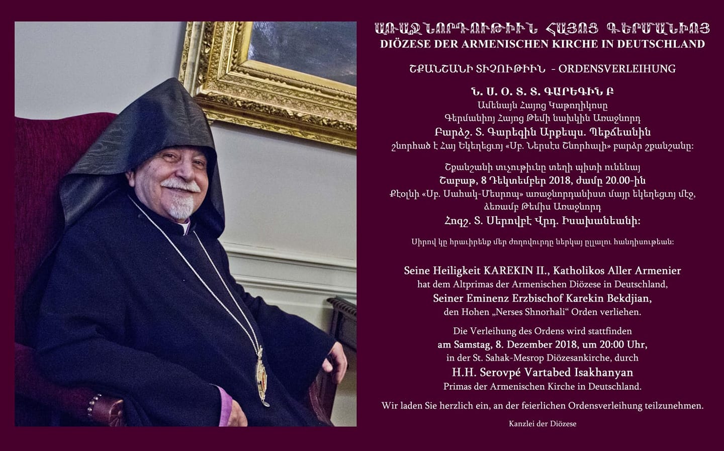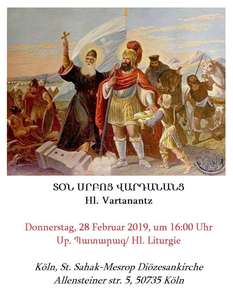 Wir laden unsere Gemeinschaft ein, unseren Bischof am Abend desselben Tages, um 19 Uhr, in der St. Sahak-St. Mesrop Diözesankirche in Köln mit der Begrüßungszeremonie „Hraschapar“ willkommen zu heißen und seinen bischöflichen Segen zu empfangen.