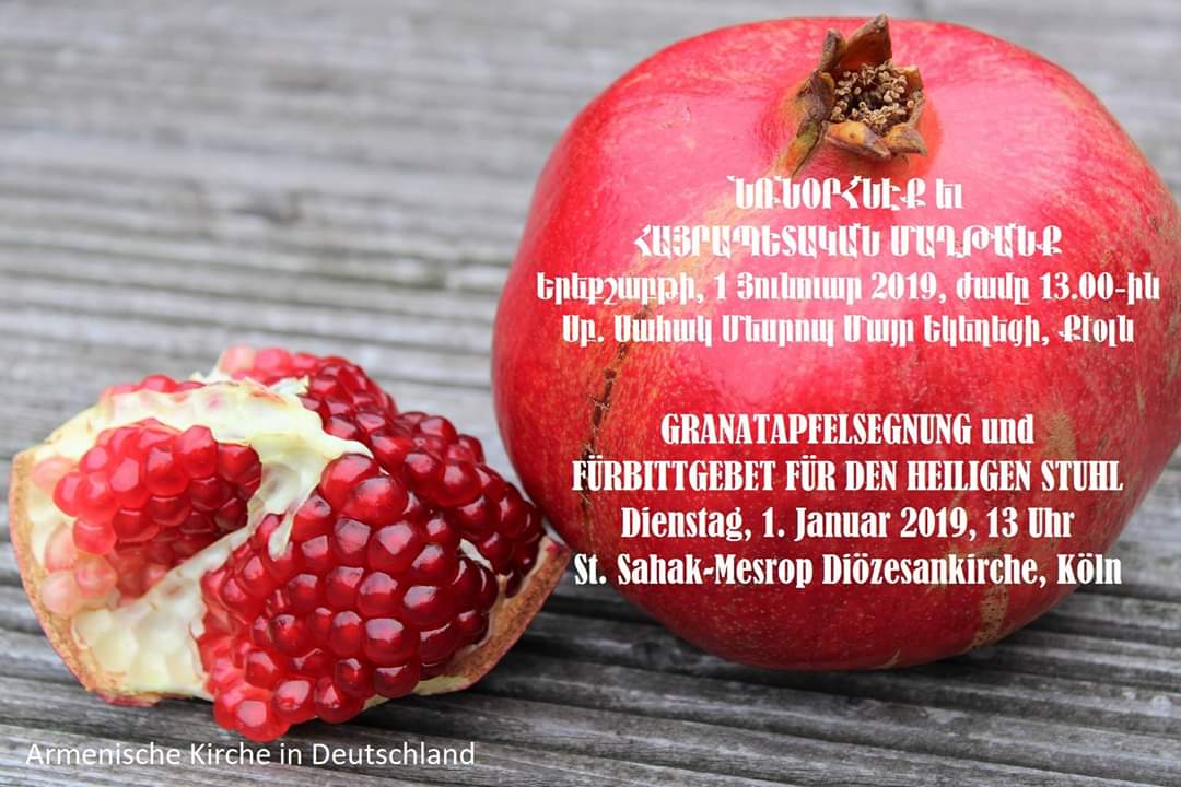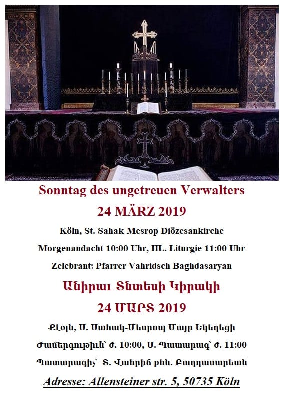 Գերմանիոյ մեր գաղութայիններուն սիրով կը հրաւիրենք աղօթելու Թեմակալ Առաջնորդին բարօրութեան եւ արեւշատութեան, ինչպէս նաեւ առաքելահաստատ մեր Սուրբ Եկեղեցւոյ պայծառութեան եւ անսասանութեան համար: