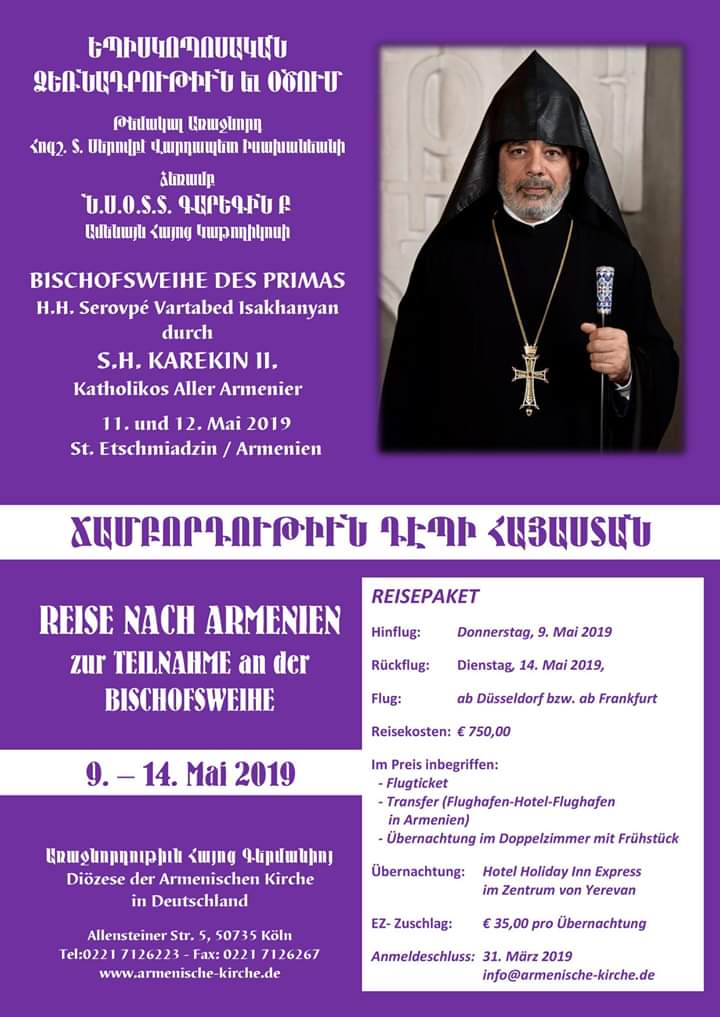 Այսու մեծ ուրախութեամբ կը ծանուցանենք, որ Գերմանիոյ Հայոց Առաջնորդ, նորաօծ Գերաշնորհ Տ. Սերովբէ Եպս. Իսախանեան, 20 Մայիս 2019, Երկուշաբթի օրը պիտի վերադառնայ Քէօլն, իր առաջնորդական աթոռը: